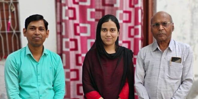 गाजीपुर। भाजपा के सदर पश्चिमी मंडल मीडिया प्रभारी परवेज खान की भतीजी शाहीन परवीन (खुशी) द्वारा ख्वाजा मोइनुद्दीन चिश्ती विश्वविद्यालय लखनऊ से बी.एस.सी. माइक्रो बायलॉजी में प्रथम स्थान और उत्तर प्रदेश के राज्यपाल आनंदीबेन पटेल द्वारा गोल्ड मेडल दिए जाने के बाद अपने पैतृक गांव सरैया छावनी लाईन गाजीपुर लौटने पर पी.जी. कालेज गाजीपुर के भूतपूर्व प्रोफेसर (मनोविज्ञान) डॉ० बी.डी. मिश्रा ने उनके घर आकर ढेरों बधाई, आशीर्वाद और शुभकामनाएं दी।इस अवसर पर श्री मिश्रा कहा कि बेटा तुमने अपने घर का ही नहीं पूरे जिले का नाम गौरवान्वित किया है। मेरी शुभकामनाएं है तुम अपने जीवन में आगे और भी उच्च शिक्षा प्राप्त करो और अपने जिले का ही नहीं अपने देश का नाम रोशन करो।हर मां बाप का सपना होता है कि मेरा बेटा नाम करे और आज तुमने वो कर दिखाया है।इस अवसर पर परिवार के सभी सदस्यों ने खुश होकर डॉ बी.डी. मिश्रा और शाहीन परवीन का मुंह मीठा कराया और का आभार प्रकट किया।