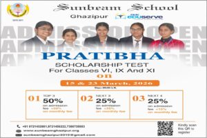 गाजीपुर। सनबीम स्कूल गाजीपुर प्रतिभावान छात्र-छात्राओं के लिए स्कॉलरशिप टेस्ट 2026 का आयोजन 15 व 23 मार्च को आयोजित कर रहा है। इस संदर्भ में सनबीम स्कूल के निदेशक नवीन सिंह ने बताया कि प्रतिभावान छात्र-छात्राओं को प्रोत्साहित करने के लिए स्कॉलरशिप टेस्ट कक्षा-6, 9 और 11 के छात्र-छात्राओं के लिए आयोजित किया जा रहा है। जिसमे टॉप थ्री छात्र-छात्राओं के लिए एडमिशन फीस और 50 प्रतिशत प्रति माह फीस डिस्काउंट हो जायेगा। दूसरे स्थान के तीन बच्चों के लिए एडमिशन फीस और 25 प्रतिशत प्रति माह फीस डिस्काउंट हो जायेगा। तीसरे स्थान पर चार बच्चों के लिए एडमिशन फीस और प्रति माह 15 प्रतिशत डिस्काउंट हो जायेगा। अधिक जानकारी के लिए मोबाइल नम्बर 9721452881, 9721456222, 7388735883 पर संपर्क कर सकते हैं।