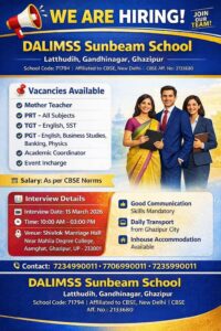गाजीपुर। जिले के प्रतिष्ठित शिक्षण संस्थान डालिम्स सनबीम स्कूल, लट्ठुदीह, गांधीनगर, गाजीपुर द्वारा विभिन्न पदों पर योग्य एवं प्रतिभाशाली शिक्षकों की भर्ती के लिए साक्षात्कार आयोजित किया जा रहा है। यह भर्ती प्रक्रिया 15 मार्च 2026 को आयोजित की जाएगी। विद्यालय प्रबंधन द्वारा दी गई जानकारी के अनुसार, इस भर्ती में मदर टीचर, PRT (सभी विषय), TGT (English, SST), PGT (English, Business Studies, Banking, Physics), एकेडमिक कॉर्डिनेटर, इवेंट इंचार्ज के पदों के लिए आवेदन आमंत्रित किए गए हैं। चयनित अभ्यर्थियों को CBSE मानकों के अनुसार वेतन प्रदान किया जाएगा। साक्षात्कार का आयोजन प्रातः 10:00 बजे से दोपहर 3:00 बजे तक शिवलोक मैरिज हाल, महिला डिग्री कॉलेज के पास, आमघाट, गाजीपुर में किया जाएगा। विद्यालय प्रबंधन ने बताया कि सभी अभ्यर्थियों के लिए अच्छी कम्युनिकेशन स्किल अनिवार्य है। इसके अलावा विद्यालय की ओर से गाजीपुर शहर से दैनिक परिवहन सुविधा तथा इनहाउस आवास की सुविधा भी उपलब्ध कराई जाएगी। इच्छुक एवं योग्य अभ्यर्थी निर्धारित तिथि पर अपने आवश्यक दस्तावेजों के साथ साक्षात्कार में शामिल हो सकते हैं। अधिक जानकारी के लिए अभ्यर्थी 7234990011, 7706990011, 7235990011 पर संपर्क कर सकते हैं। विद्यालय प्रबंधन ने योग्य एवं उत्साही शिक्षकों से इस अवसर का लाभ उठाने और शिक्षा के क्षेत्र में अपना योगदान देने की अपील की है।